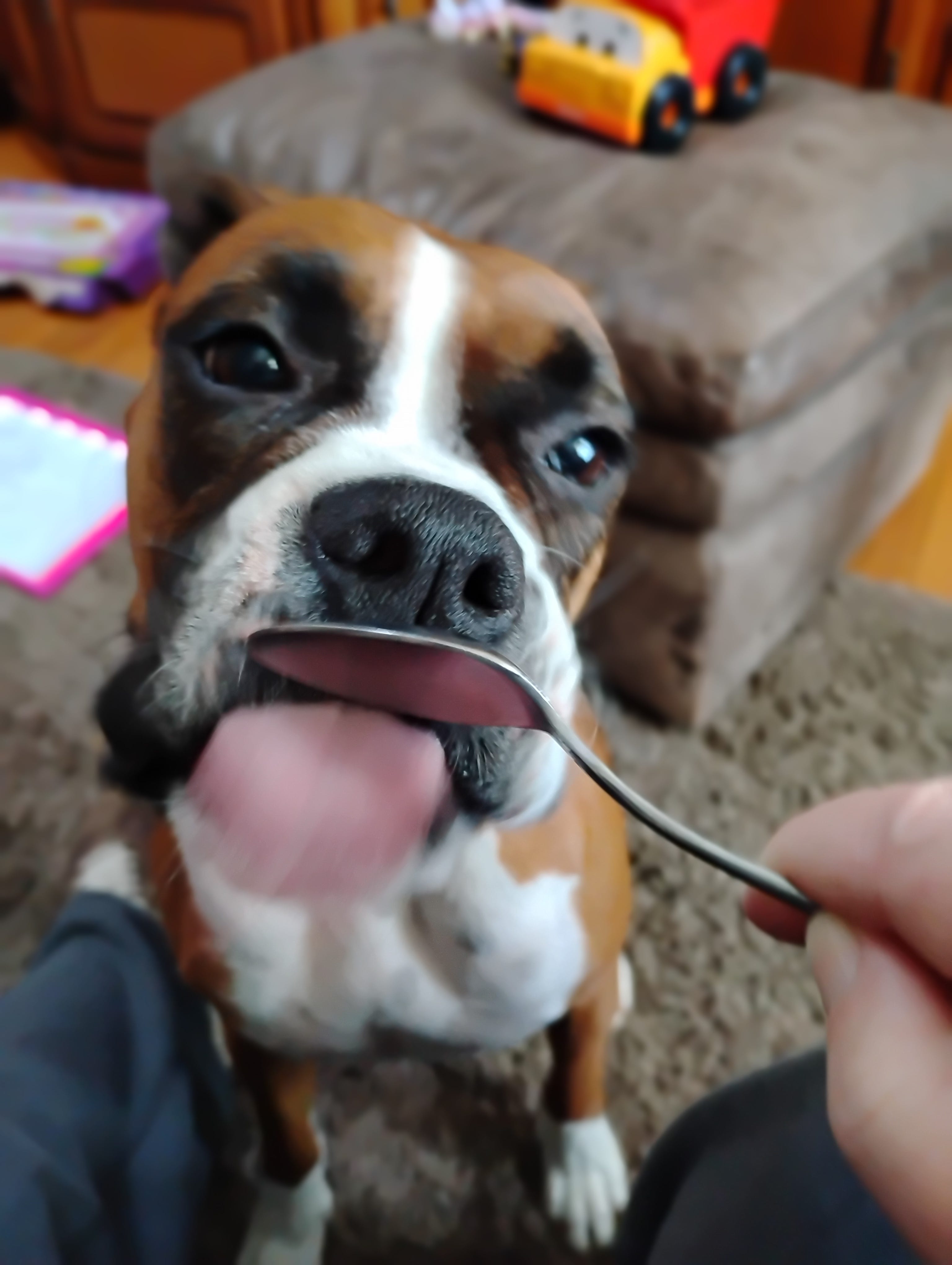 Mom kept giving me little tastes, and each time I was like “yes, I remember this, this is my favorite thing,” but also “wait, let me taste it again to make sure.” Quality control is important. Between licks, I was doing this thing where I’d sit back and smack my lips, trying to process the magnitude of what was happening. Pete was on the couch next to us, and I briefly considered sharing with him, but let’s be honest. Pete can’t open his mouth. This moment was mine. My cold nose pressed against Mom’s hand, my nub wagging so hard I was practically spinning, this weird brain freeze sensation happening that I didn’t understand but also didn’t hate.
